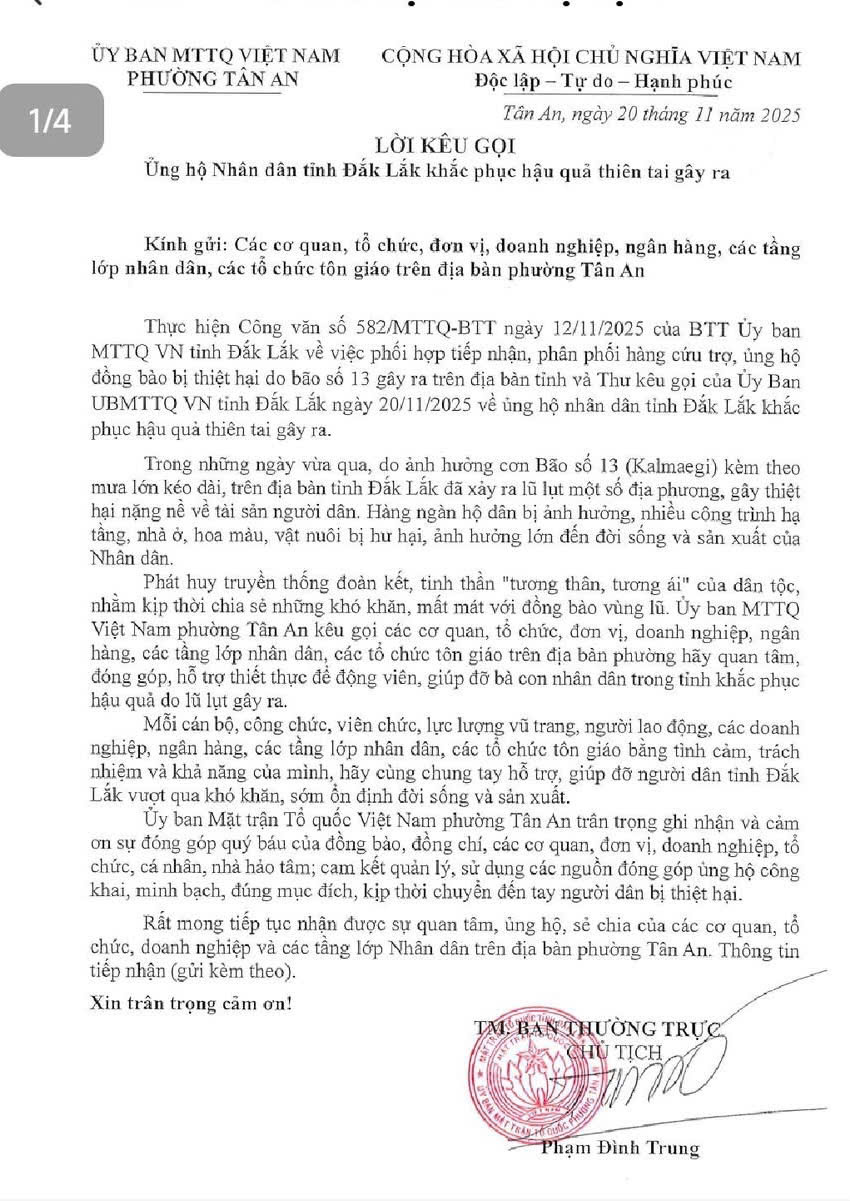Phát huy truyền thống đoàn kết, tinh thần "tương thân, tương ái" của dân tộc, kịp thời chia sẻ khó khăn, mất mát với đồng bào vùng lũ lụt, hưởng ứng Lời kêu gọi của Ủy ban MTTQ Việt Nam tỉnh Đắk Lắk, Uỷ ban MTTQ VN phường - Ban Vận động cứu trợ phường Tân An kêu gọi các cơ quan, tổ chức, đơn vị, doanh nghiệp, ngân hàng; các tổ chức tôn giáo; các tầng lớp Nhân dân trên địa bàn phường cùng chung tay ủng hộ đồng bào vùng thiên tai.